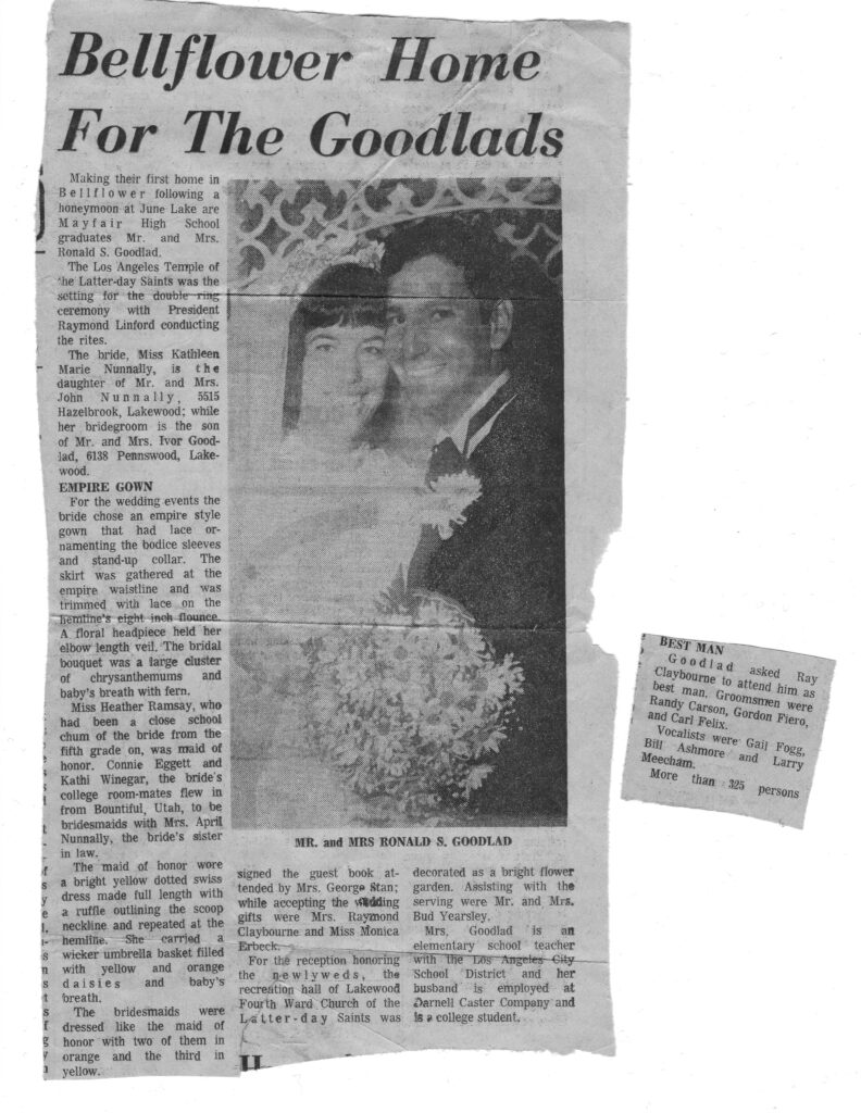 After returning from my mission, I wanted to find the person I would spend eternity with. I attended a young adult activity in the mountains near my home. There, I met Kathy Nunnally, a recent BYU graduate. As she said it, a few friends there asked her to introduce them to me, since I was in her ward. She brought them over but never introduced them because she became engaged in our conversation herself. (Her story) A few days later, I saw her teaching at a children’s meeting at Church. She was in her natural element, guiding children. I could not take my eyes off her and knew I wanted to get to know her better. After the meetings, I found her as quickly as I could. We spoke briefly, and I asked her if she would see the movie “Fiddler on the Roof” with me. I didn’t know that she had just seen the movie the two days earlier. But she said, “Yes.” That Friday, when she took my hand during the movie, I knew I wanted it there forever. It seemed like I had known her for a lifetime. She seemed to belong at my side. A few days later, another young adult activity was held at Recreation Park in Long Beach. I didn’t know the name, Recreation Park, so I asked Kathy to ride with me and show me where it was. (Kathy has a different version of this story. She claims this was my plot to get her to ride with me. But, if her version puts her with me in the car, so be it.) We never found the activity; instead, we talked at the beach while sitting in my vehicle. After a few more dates, I proposed to her, though she wasn’t thinking about marriage this early in our relationship. Also, she had been dating another guy who was away for employment training. She thought about my proposal for a week, then said, “Yes”. I do feel sorry for the guy who was away for work. But then Kathy told me he wasn’t on her list of future husbands because of his view of where to take their lives.
